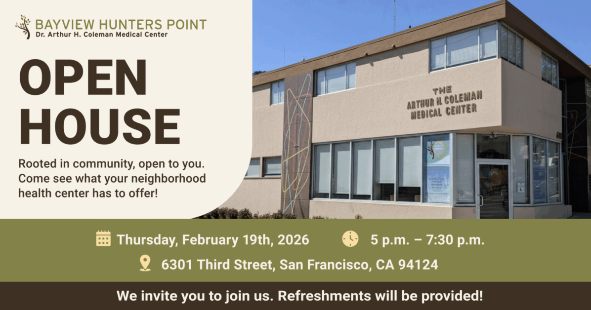 Please Join Us! Bayview Hunters Point Open House – February 10Posted on January 16, 2026By Editorial Team Open HouseBayview Hunters Point Filed under: Marin City Clinic